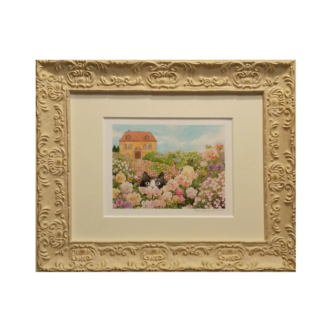華やかな花畑の中にひょっこりと顔を覗かせる猫。その後ろには日傘をさした女性が描かれています。夢に出て来そうな華やかな世界ですね。