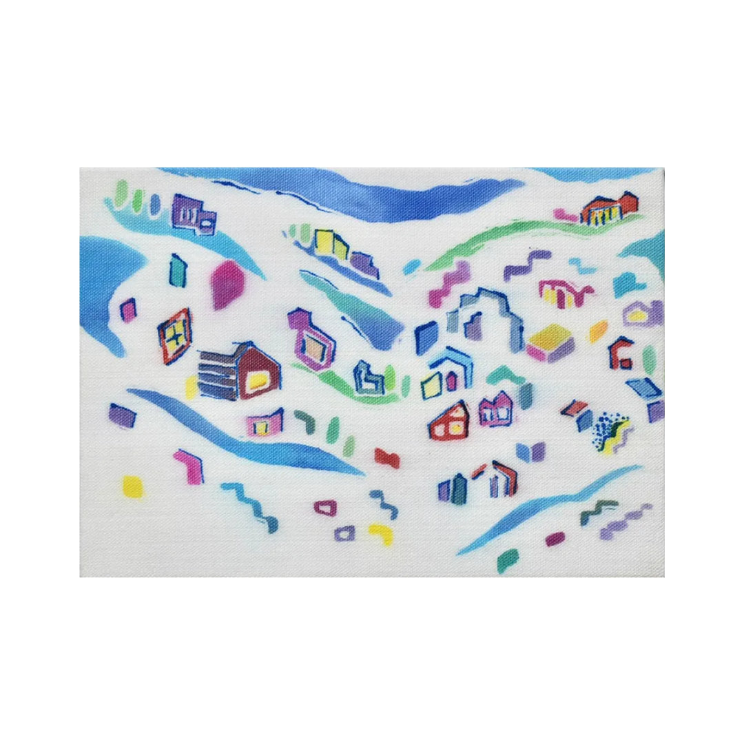 涼しげな色彩で描かれた俯瞰的な街並の風景は、模様のようにも見えます。カラフルな建物の中には窓や壁といった部分だけが見えるものもあり、幾何学的な形の面白さが強調されています。友禅染の優しい色合いと風合いをコンパクトにお楽しみいただけます。
