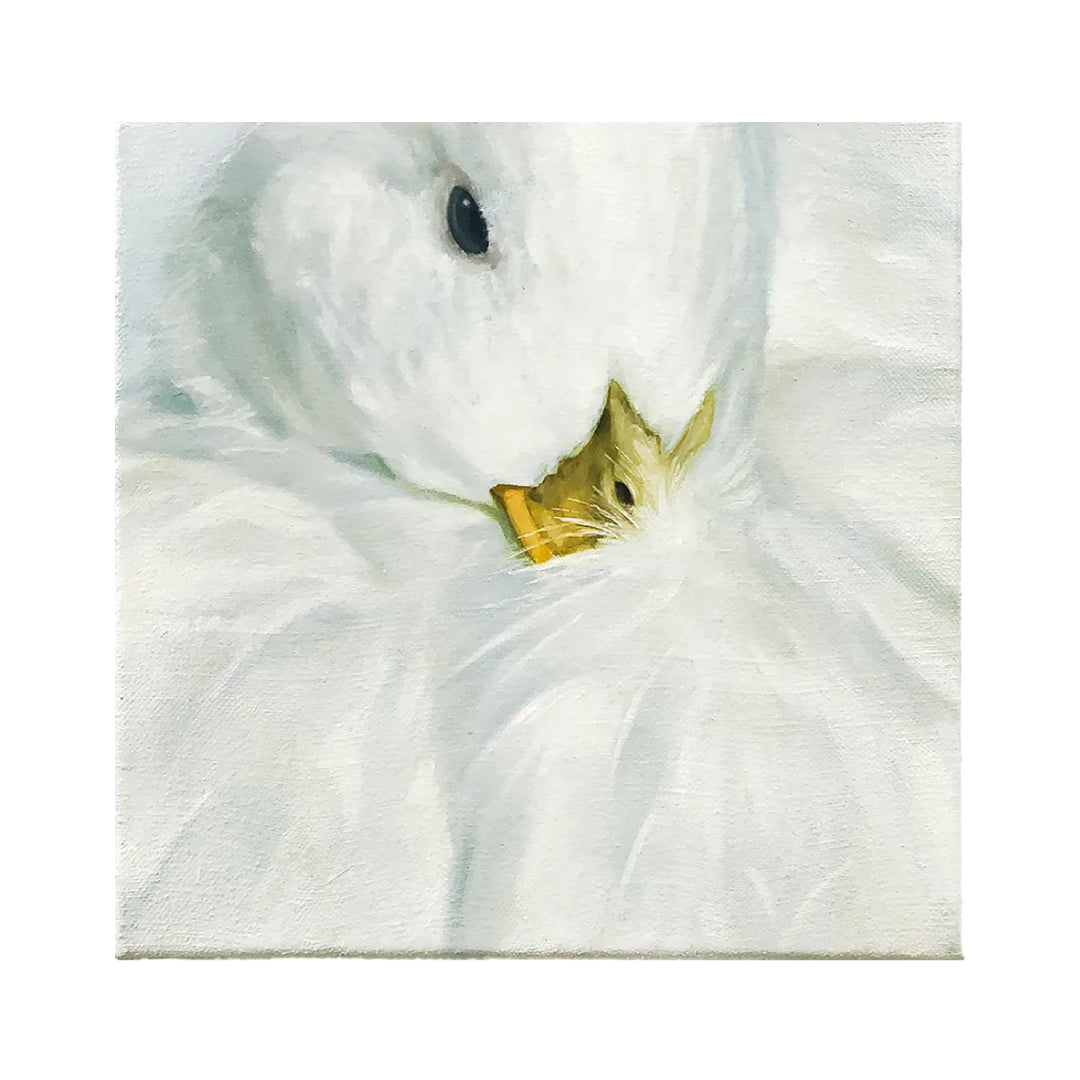 コールダックの白い羽毛がキャンバス全体を埋め尽くし、柔らかな手触りや温もりを感じさせます。黄色いくちばしをうずめて今にも眠りそうな表情が愛らしいですね。小さめの作品なのでどこにでも飾ることができ、癒しと安らぎをもたらしてくれます。
