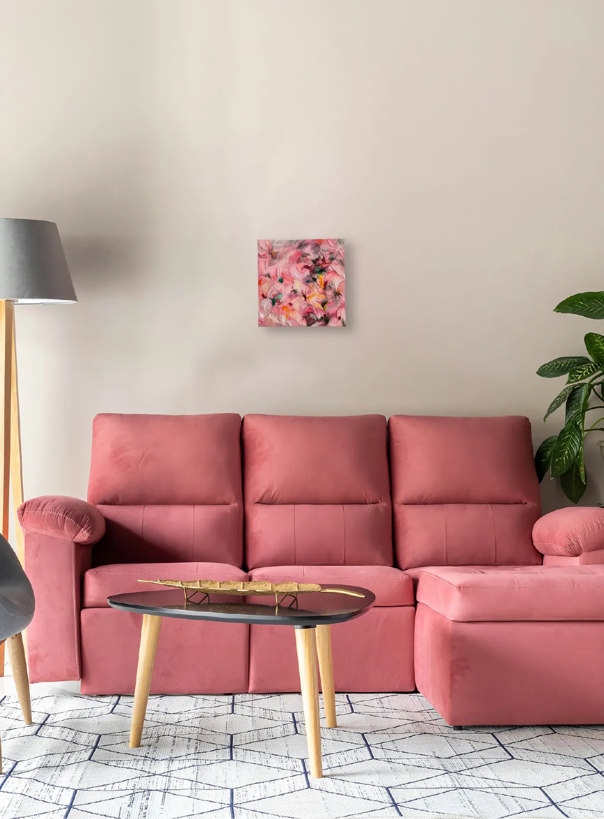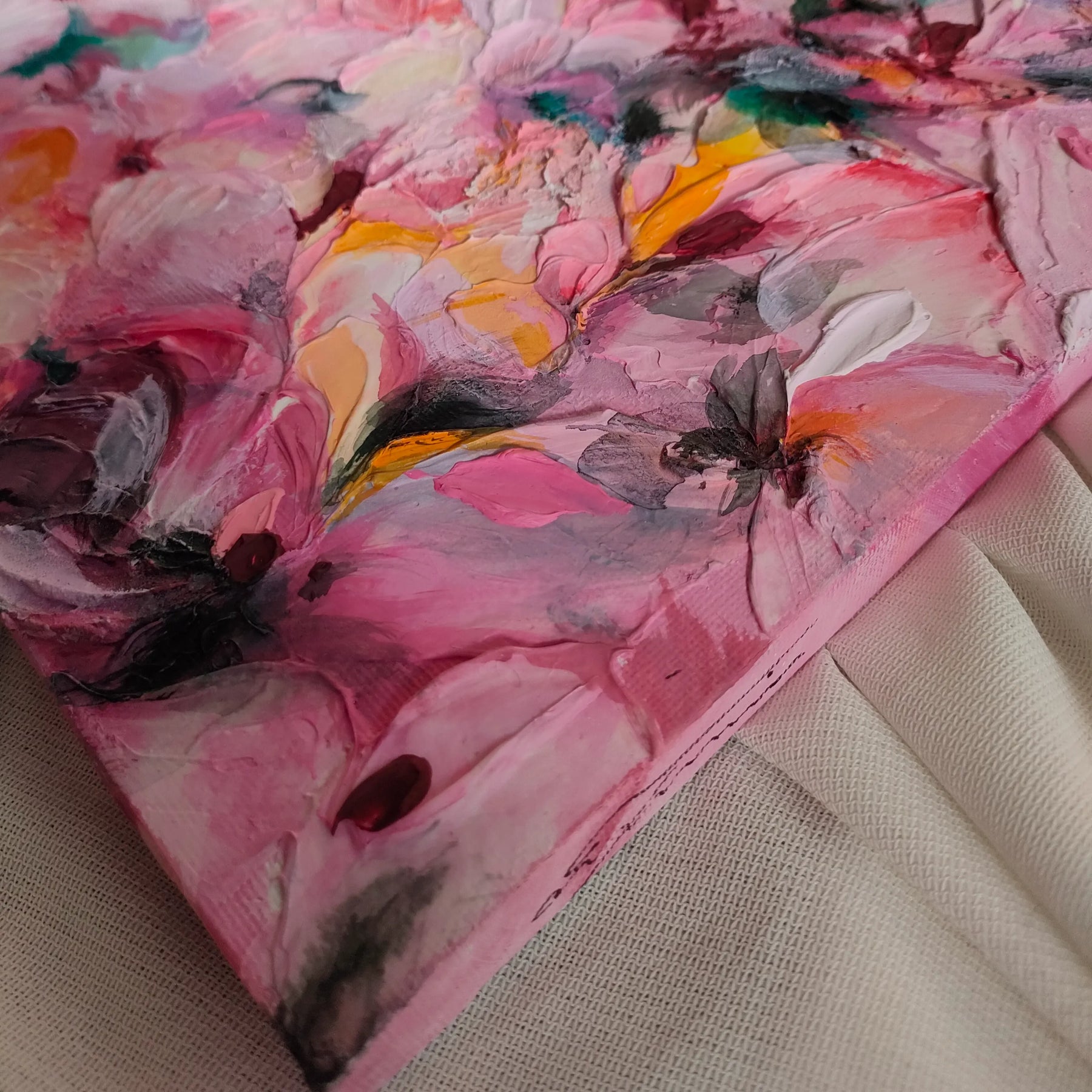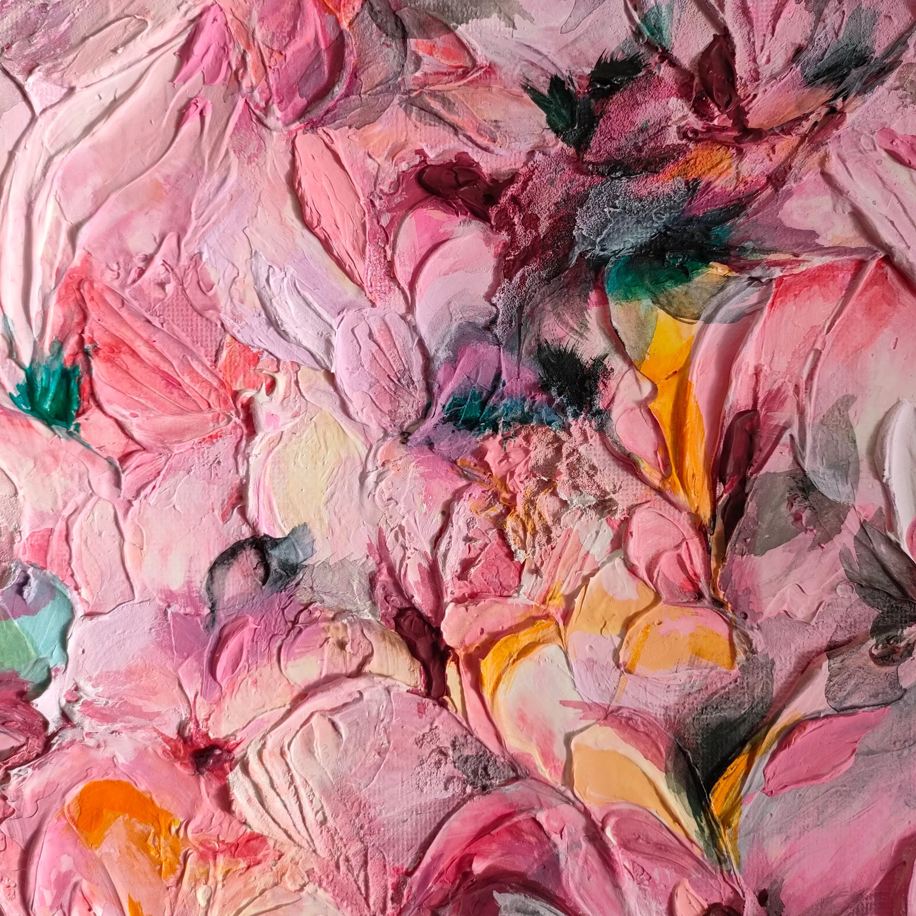 幾重にも重なる花びらのように、やわらかな色彩が溶け合う作品。ピンクやオレンジ、グリーンが織りなす世界は、生命が芽吹く春の瞬間を思わせます。厚みのある絵の具の質感が光をやさしく反射し、時間とともに異なる表情を見せてくれます。飾るだけで空間がふんわりと明るくなり、心をやさしく包み込むような一枚です。