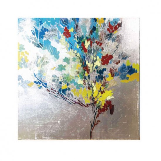 シンプルでカラフルな表現で、自然を描き出す高原秀平。当作品は珍しいシルバー地に様々な画材で木々や花を描き、その色のバランスや質感の違いを楽しめる作品で、5連作となっています。