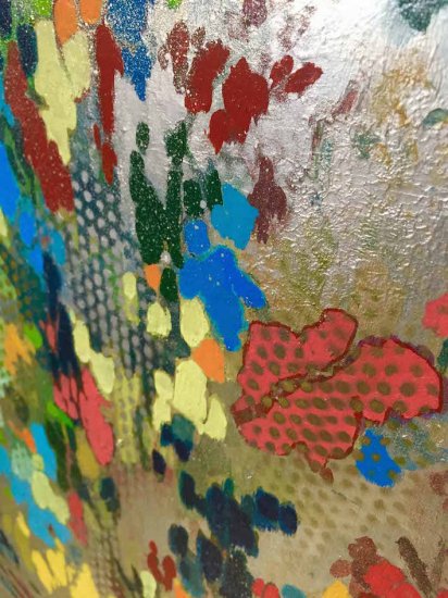 - 油絵の具とクレヨンとラッカースプレーを併用しています。 背景の銀色が光を反射し、光の当たり方や、見る角度によって、様々な表情を見せます。