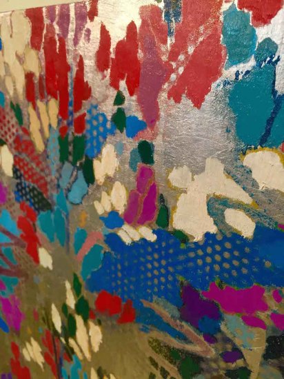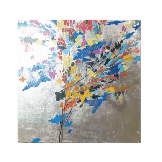 シンプルでカラフルな表現で、自然を描き出す高原秀平。当作品は珍しいシルバー地に様々な画材で木々や花を描き、その色のバランスや質感の違いを楽しめる作品で、5連作となっています。