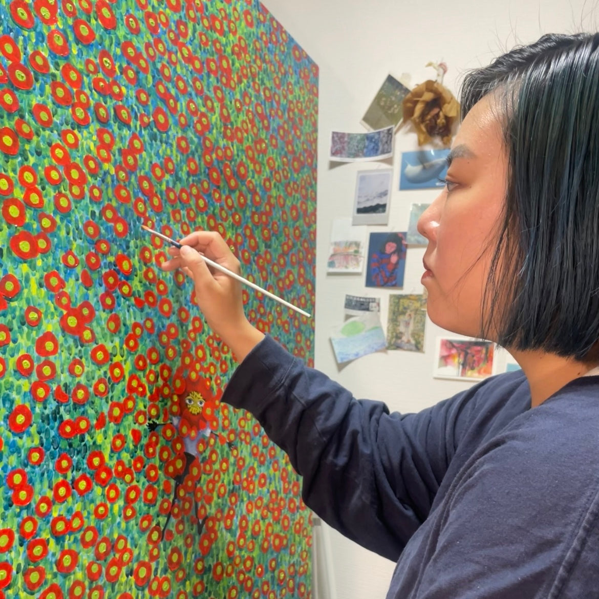 - You.は自分自身と人そのものを愛するため、心の奥にある憧れや心地よさを形にした作品を生み出している。奈良の自然豊かな環境と孤独な幼少期が創作の原点。空想の世界に救われた彼女は、自由な表現に惹かれアパレルを経て独学で油彩を始める。抽象画から始まり、次第に自分の「好き」に正直な表現を追求。ゴッホやウィリアム・モリスに影響を受け、温かくも切なさを感じさせる作品世界を築いていった。現在は平面と立体を融合させた「permeate art」シリーズを展開し、空間に溶け込むような作品づくりを続けている。