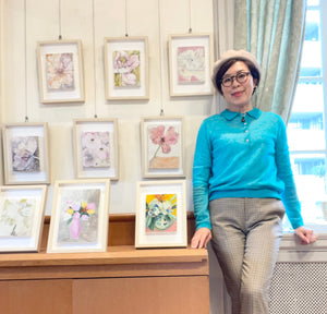水彩の滲みがキャンバスでたゆたう、繊細な美しさに惹かれます。空間に溶け込みつつ、近づくほどに手仕事の温もりが伝わり、心をやさしく弛めてくれる一枚です。