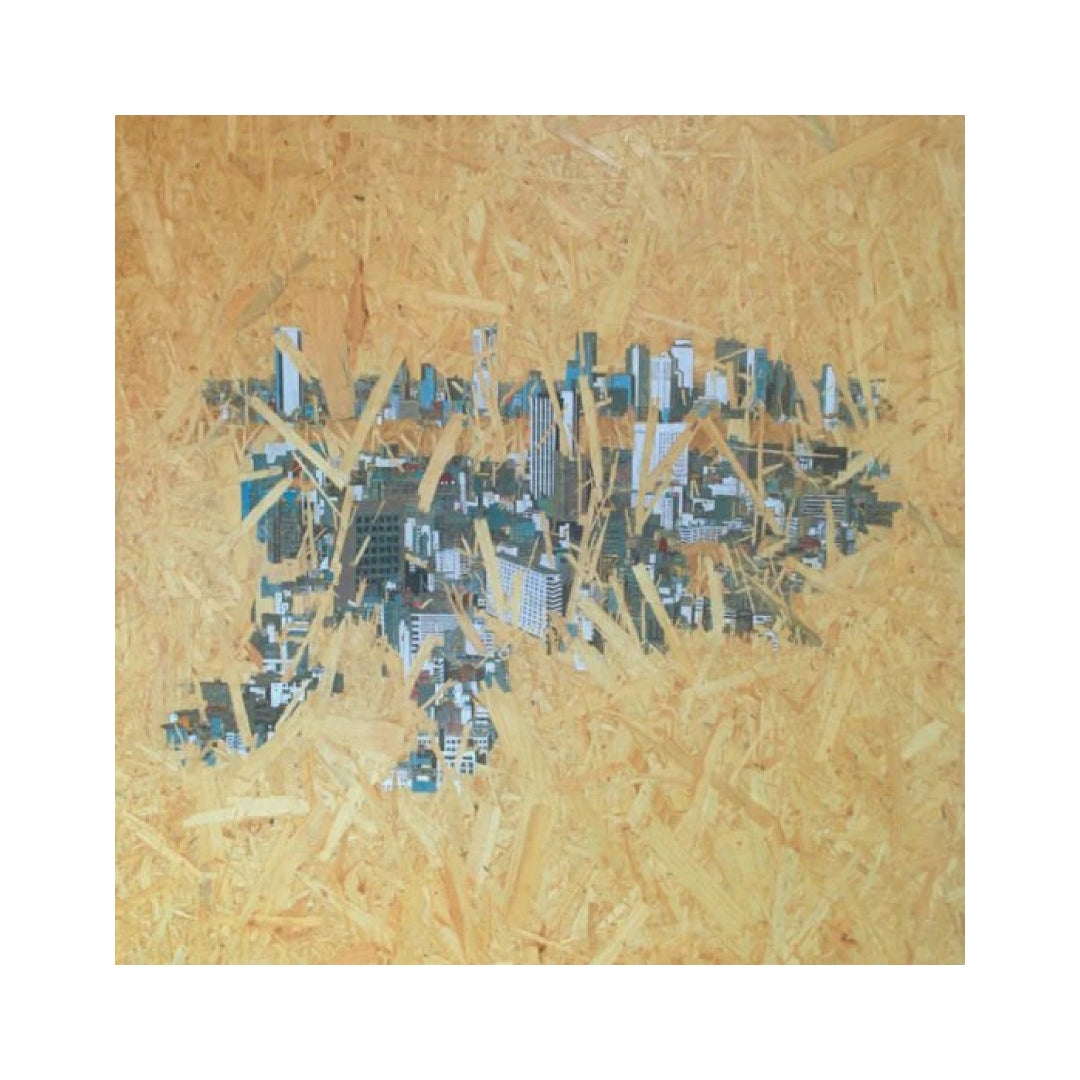 Painting series “Landscape of industrial wooden material”. Weaving city-scape into building material(OSB board). OSB already has a smell of modern city-scape in it. Painting or collaging into the pattern of board shows the vivid landscape of city now. ///////////////////////////////////////////////////////////