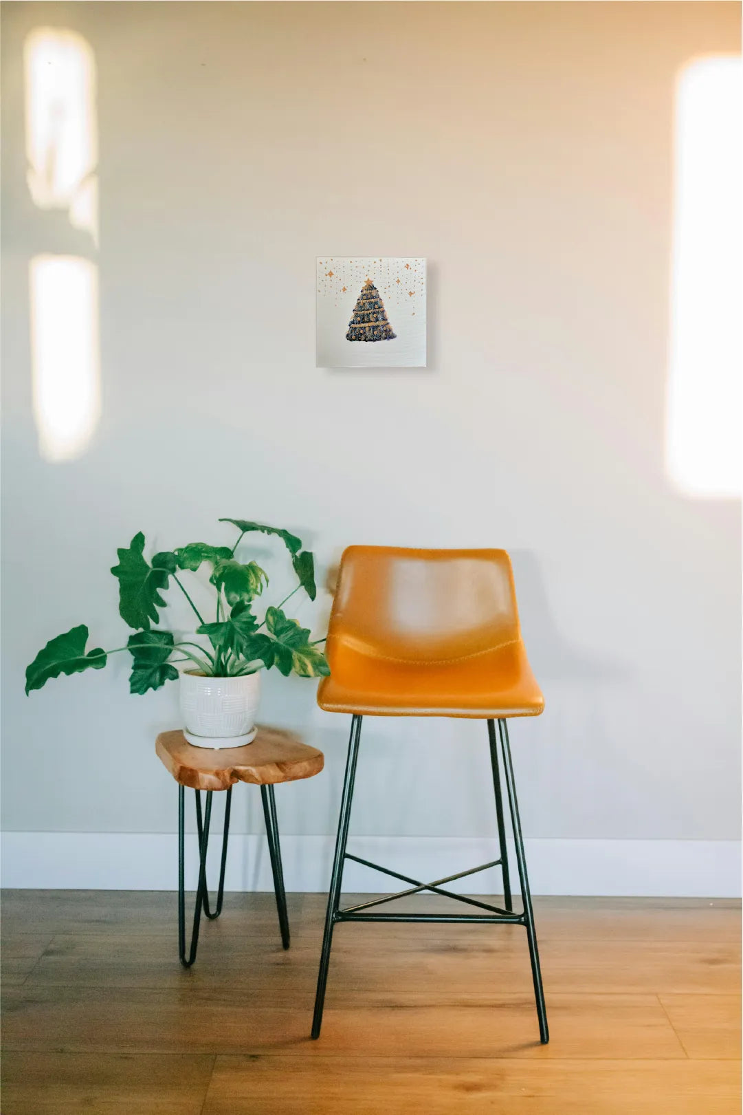 紺とゴールドのコントラストが織りなすクリスマスツリーは、まるで夜空に星がふわりと舞い降りる瞬間を切り取ったような一枚です。静かな輝きが空間に上品なアクセントを添え、シンプルインテリアや北欧テイストの部屋、落ち着いたリビングにも自然と馴染みます。