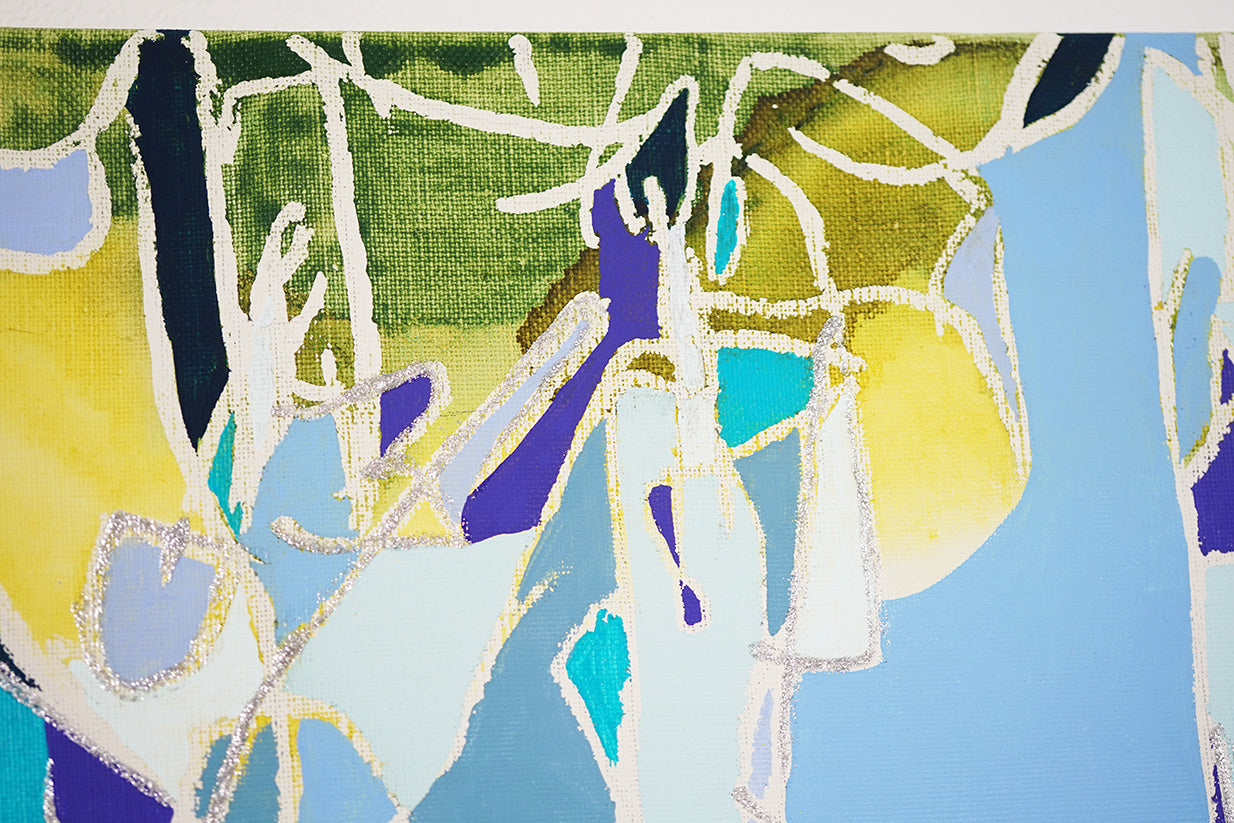 ブルー系でまとめられた落ち着いた配色。抽象的に描かれた群衆をつなぐ黄色は何を意味するのか?想像が膨らむ作品。