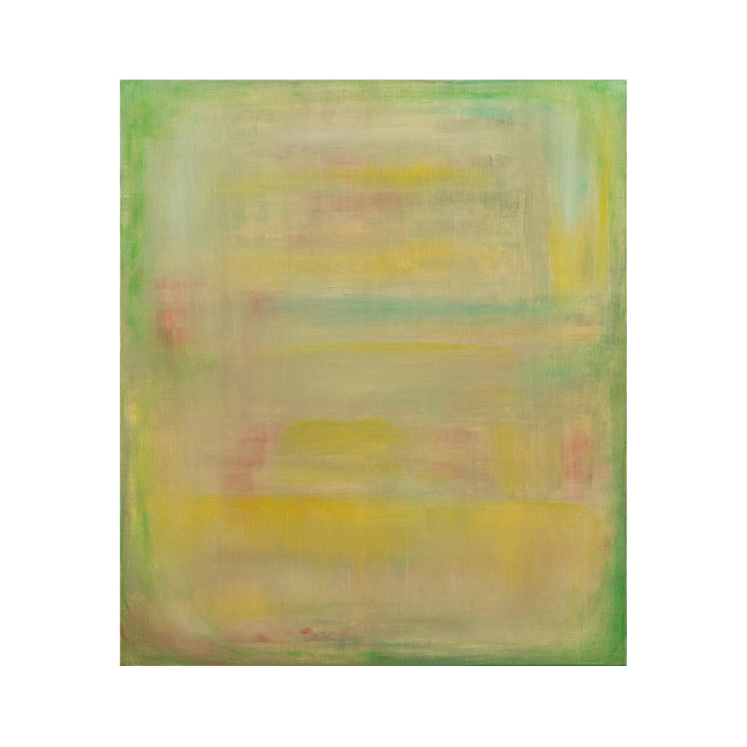 柔らかなグリーンの背景にさまざまな色が薄く塗り重ねられ、不思議な色の交わりを見せているアートです。何かが見えそうで見えない、そんな感じもしますね。