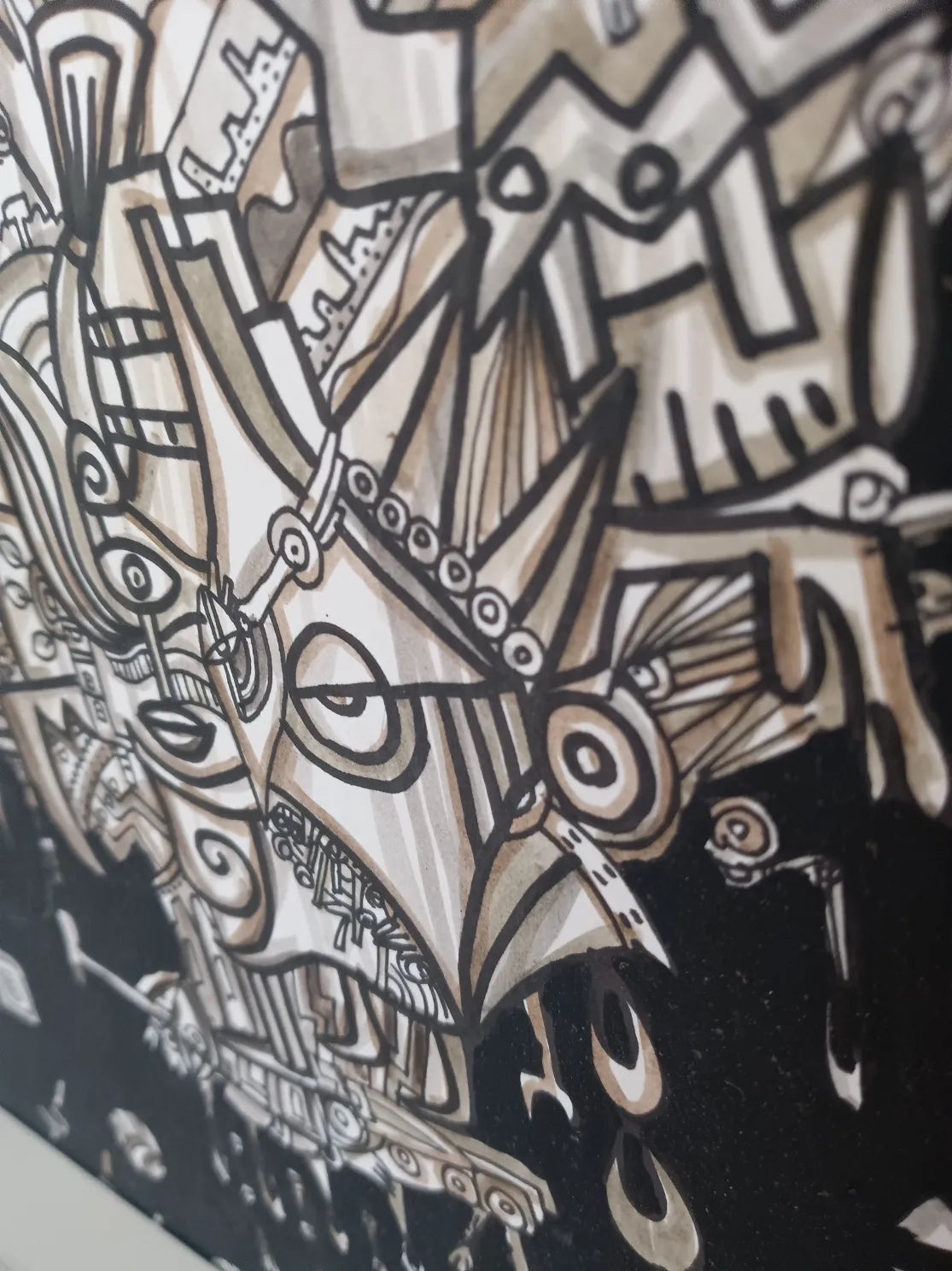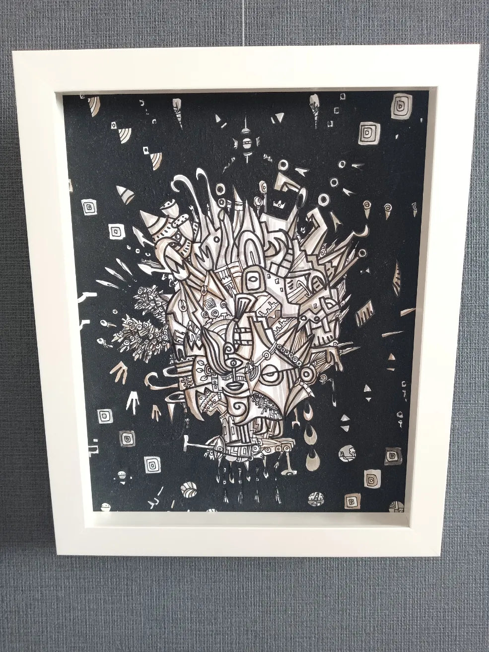 深みのあるマットな黒の背景に、緻密な白線で描かれた抽象的なモチーフが浮かび上がります。複雑に絡み合う記号やパーツは、まるで未知の文明の設計図や思考の渦を具現化したよう。モノクロームの表現は、静けさと力強い存在感を同時に放ち、見る人を思索的な世界へ誘います。書斎やオフィス、あるいは寝室に飾ることで、研ぎ澄まされたモダンな雰囲気を作り出します。特にモノトーンやインダストリアルなインテリアと相性が良く、日常に知的な刺激を加えてくれる一枚です。