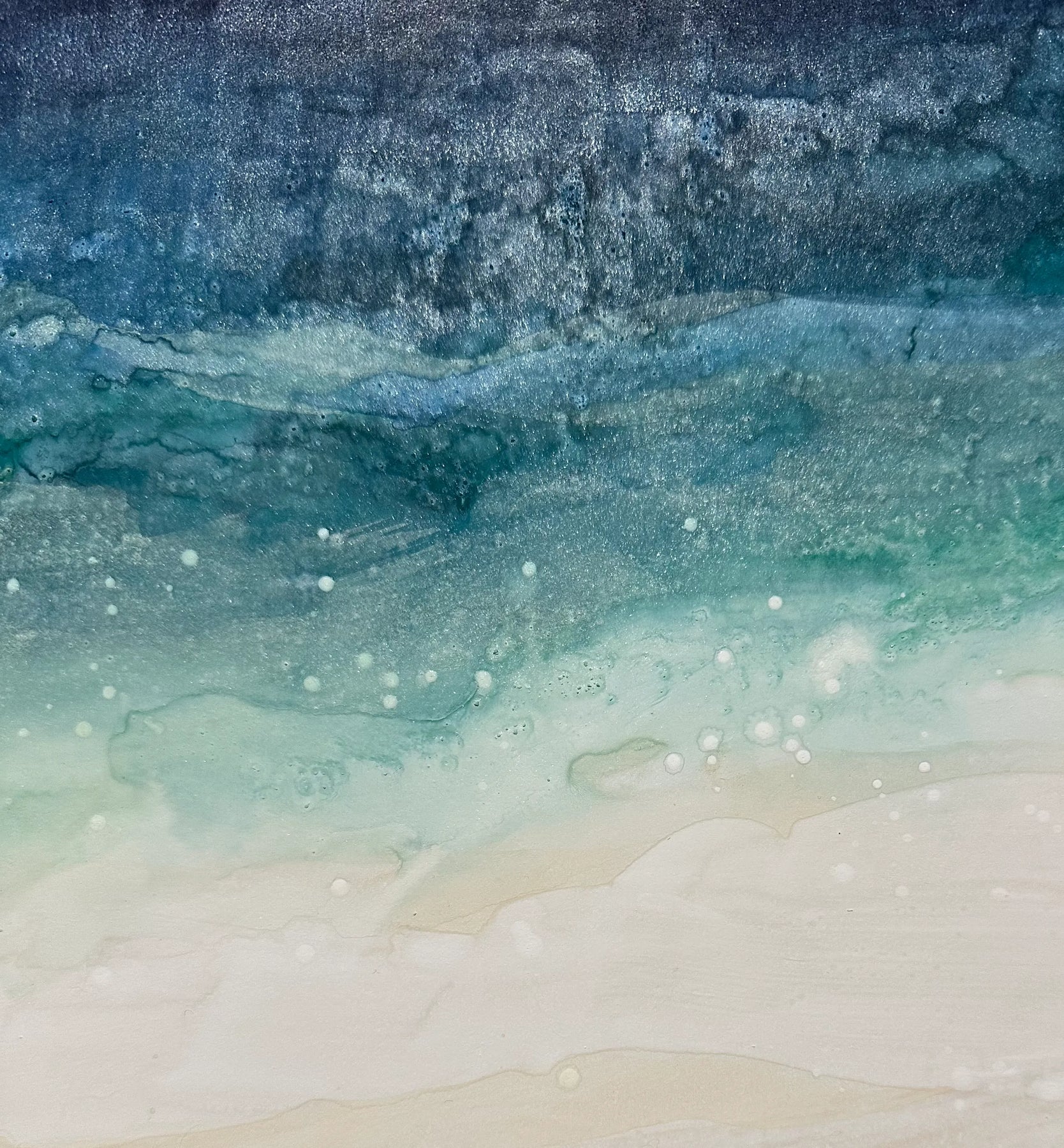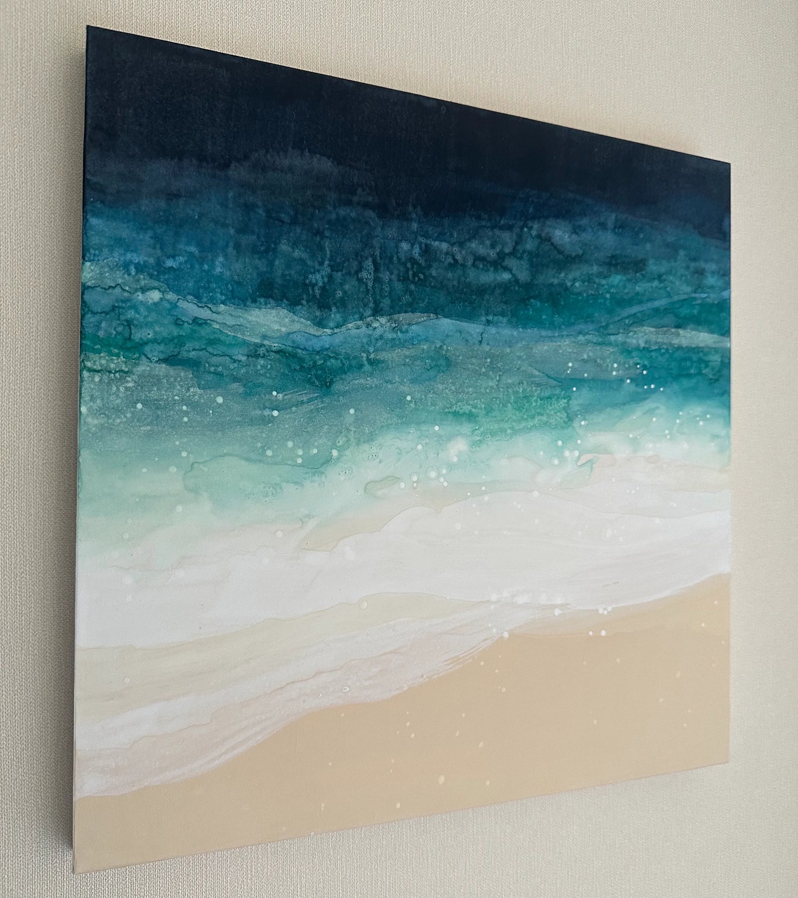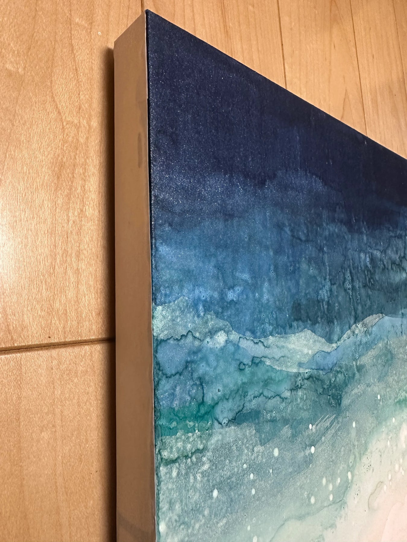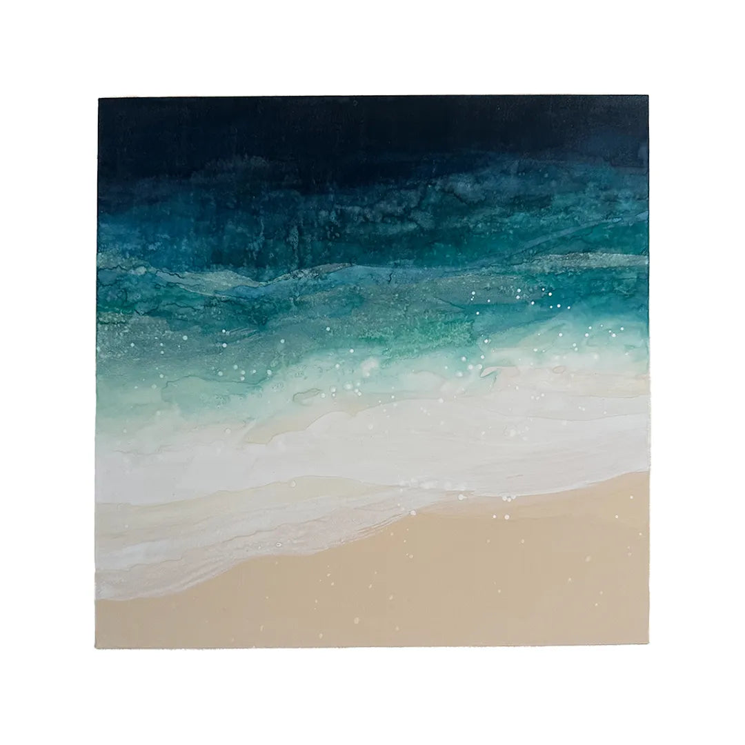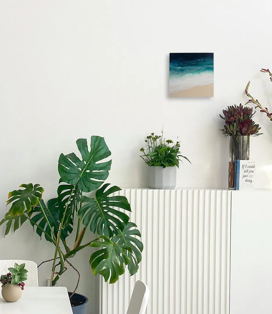 深い群青から砂色へ、色が静かに溶け合い、波の呼吸が画面に残ります。にじみや粒子が光を含み、遠い海辺に立つ感覚を呼び起こします。壁に迎えることで視線が奥へ抜け、室内に落ち着いた広がりが生まれます。寝室やリビングの壁際に、木目やリネンを用いた設えと合わせると、心地よい調和が感じられます。
