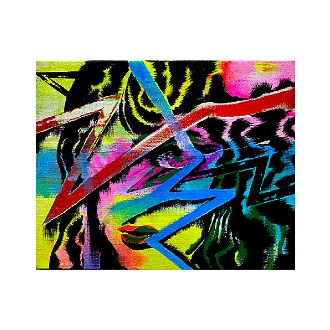 鮮やかな色彩と黒のコントラストで描く、ビビッドな感情が印象的な作品。 刺激的で衝動的な配色には、心をわしづかみにされる何かが潜んでいるようです。 ジグザグと画面を縦横無尽に走る棘の下に、こちらをジッと見つめるような女性の顔が覗いています。 強いコントラストとビビッドな色彩に、魂が揺さぶられるような衝撃を感じます。